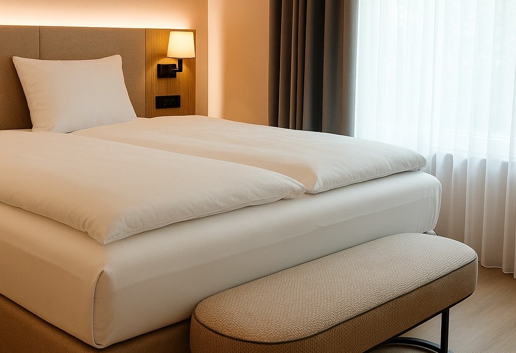 Kwalitatief hoogwaardig extra lang beddengoed en grote, zachte handdoeken van organisch katoen voor ultiem comfort.