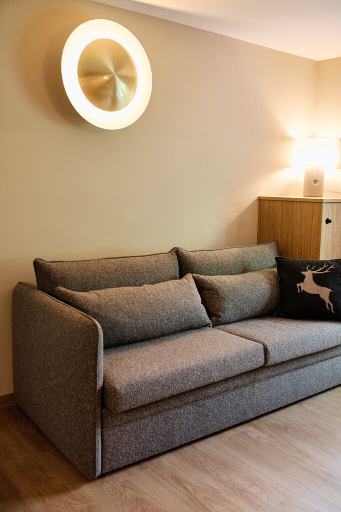 In de woonkamer is een slaapbank aanwezig, die eenvoudig kan worden omgebouwd tot een extra bed voor twee personen, waarnoor het appartement ideaal is voor een gezin of een stel vrienden.
